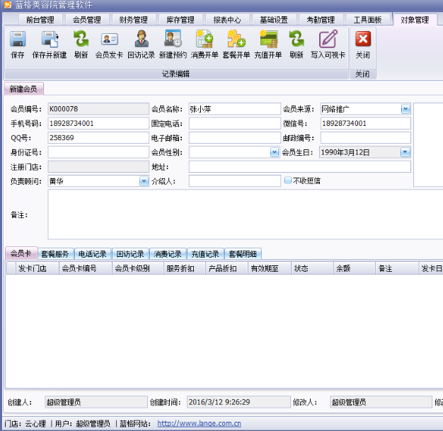 以下是傲蓝美容院会员管理软件会员资料填写的界面: