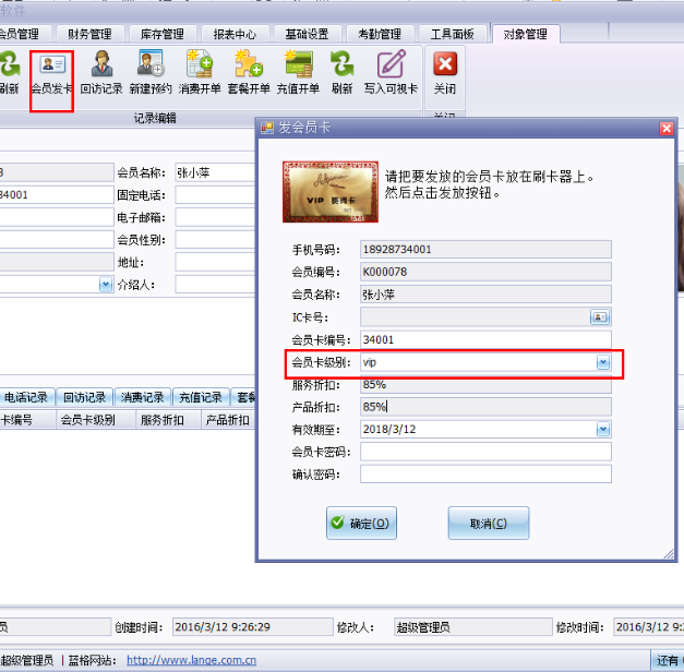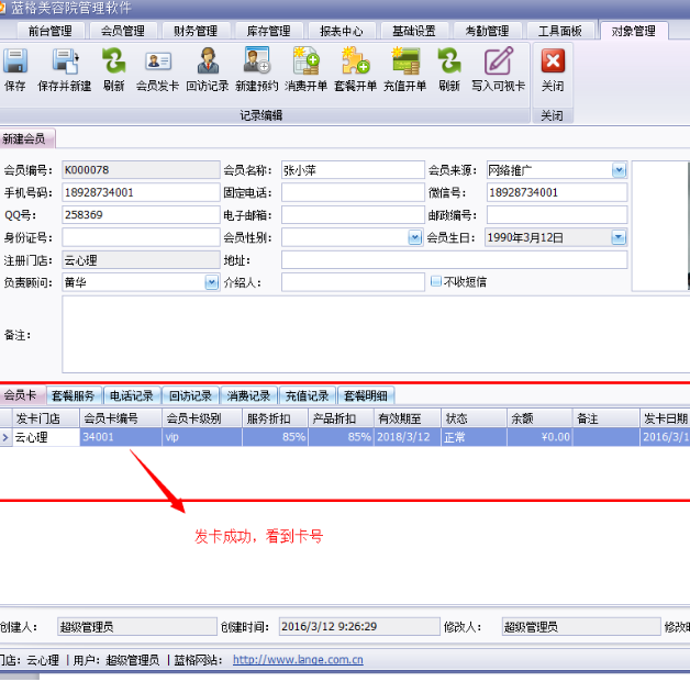 发卡成功,会员卡栏目里同时显示会员卡号和会员卡的有限日期。