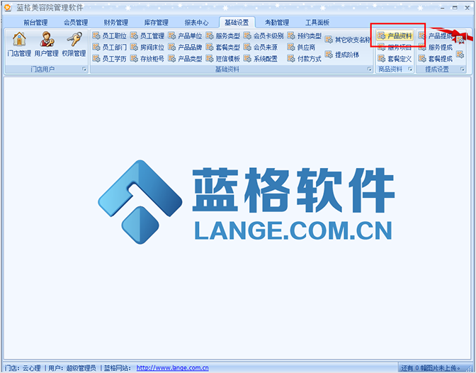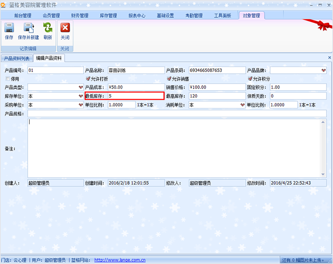 打开傲蓝美容院管理软件进入主界面后,找到并点击【基础设置】【产品资料】,当录入这些产品资料时,要录入库存数量、输入【库存】数量,当库存少于此数量时,软件就会自动自能提醒,非常方便、这样店里就可以知道这个货,要进行补货了。