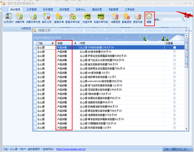 在美容院行业中,库存是非常重要的一个环节,有时候业务销量好的时候,库存是否要补货都不知道。软件中,有库存的智能提醒。
