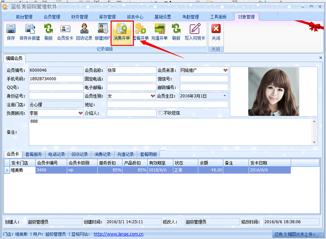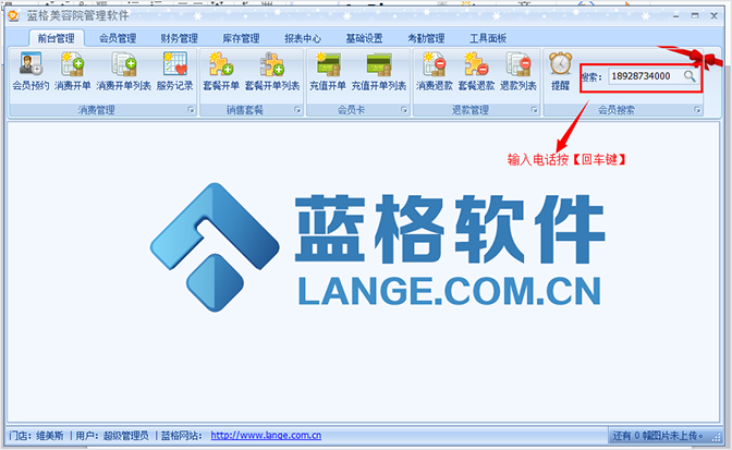 1、打开傲蓝美容院管理软件进入主界面后,在【前台管理】会员输入框,输入会员电话,按【回车键】,然后进入,会员资料界面。