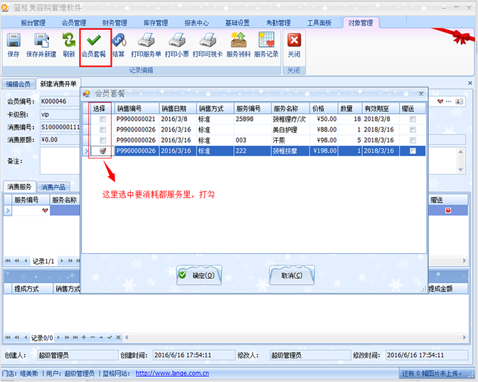 3、【会员套餐】进入套餐列表,选择消耗的服务,选中后打勾即可。