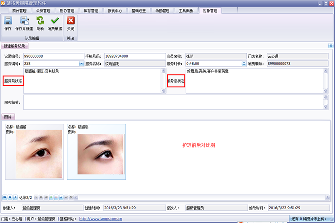 傲蓝美容院管理软件中能帮助门店美容院顾问记录每位顾客的,护理前后效果管理。